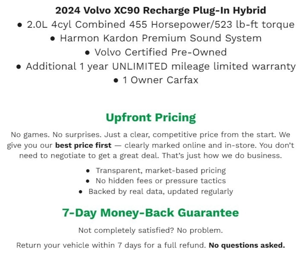 * 1-Year complimentary Volvo On Call app. Remote climate control, locks, fuel, maintenance & driving journal. Vehicle History Report with Buyback Guarantee. Includes Trip Interruption Reimbursement. Every Certified by Volvo Fully Electric & Plug-in Hybrid Comes With an 8-Year/100,000-Mile Battery Warranty.