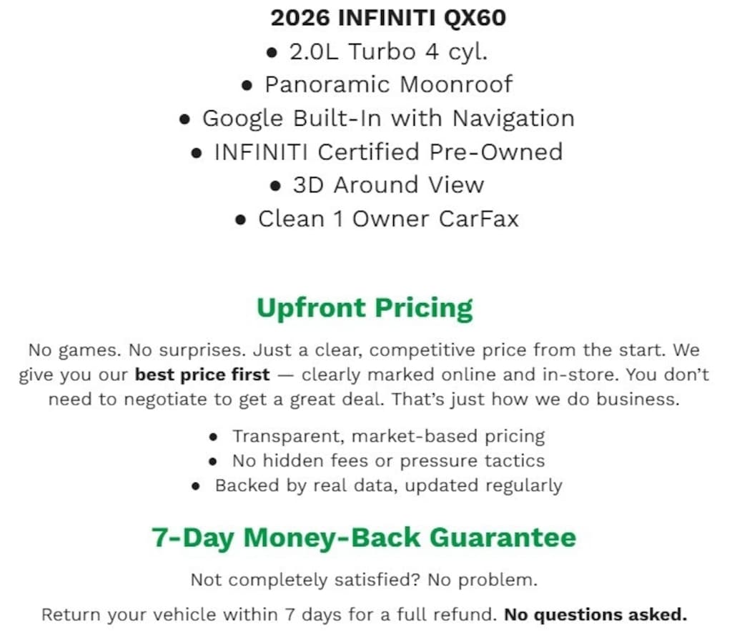 I’ve had my new qx60 for 28k miles, it has been a very competent comfortable family hauler. This is my 2nd (2017) I find it to be very nondescript in its styling while being an attractive car it’s certainly not the belle of the ball. Ride and handling/performance are above average for this segment. Access to all rows of seating is relatively easy and comfortable, luggage space is very good. My average mpg’s are 23-25mpg in all types of combined driving, this is the V6 model BTW. The controls are well labeled and easy to use, the infotainment system while the screen is not Huge is very good and easy to use, there is a touch and turn knob on the console that can operate anything you need. Overall, this is a great family hauling value, my experience with the brand (2-vehicles 435k miles)says it will be trouble free and reliable. The category is crowded with entries this one deserves a good look.… - 5.0