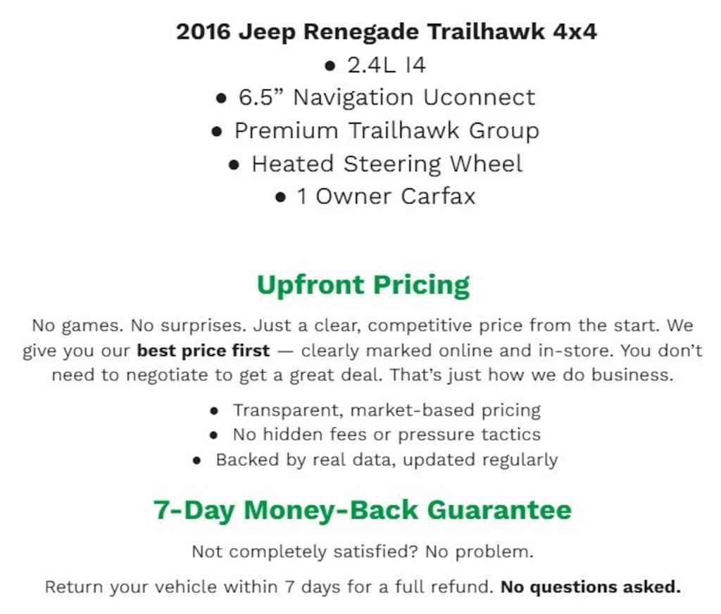 Bergstrom Premier Motorcars of the Fox Valley wants to buy your vehicle - even if you don't buy ours. Get your free and quick offer to purchase. To get our top dollar offer, call our Bergstrom Buying Team Hotline at 920-429-6222. Quick Order Package 27E, Premium Trailhawk Package (Auto-Dimming Rear-View Mirror, Heated Steering Wheel, Air Conditioning ATC w/Dual Zone Control, 40/20/40 Rear Seat w/Trunk Pass-Thru, Heated Front Seats, Power 4-Way Driver Lumbar Adjust, Power 8-Way Driver Manual 4-Way Passenger Seats, Luxury Leather Trimmed Bucket Seats, and Windshield Wiper De-Icer), MOPAR Black Interior Premium Package (Black Premium Carpet Cargo Mat, MOPAR Premium Black Carpet Mats, and MOPAR Bright Pedal Kit), MOPAR Interior Protection Package (MOPAR All Weather Mats, MOPAR Bright Door Entry Guards, and MOPAR Cargo Tray), Cold Weather Group, Trailer Tow Group (4 Pin Wiring Harness and Class III Receiver Hitch), Passive Entry Keyless Go Package (Passive Entry/Keyless Go), MOPAR Exterior Appearance Group (DISC) (Mopar Chrome Front Air Deflector, MOPAR Splash Guards, MOPAR Side Window Deflectors, and MOPAR Front Splash Guards), Safety & Security Group (Security Alarm, Tonneau Cover, and Blind Spot & Cross Path Detection), 6.5 Navigation Group w/Uconnect (6.5 Touchscreen Display, SIRIUSXM Traffic, For Details Visit DriveUconnect.com, 1 Yr Trial (Registration Required), 5-Year SiriusXM Traffic Service, 5-Year SiriusXM Travel Link Service, Radio: Uconnect 6.5 Nav, HD Radio, Uconnect Access, SiriusXM Travel Link, Remote USB Port, and GPS Navigation), MOPAR Brown Interior Premium Package (DISC) (Brown Premium Carpet Cargo Mat and MOPAR Brown Premium Carpet Cargo Mat), Safety & Security Group I (DISC), Popular Equipment Group (115V Auxiliary Power Outlet), Body Color Roof, Manufacturer's Statement of Origin, Roof rack: rails only, Spoiler, Power door mirrors, Turn signal indicator mirrors, Heated door mirrors, Driver vanity mirror, Driver door bin, Front reading lights, Compass, Tilt steering wheel, Leather Shift Knob, Overhead console, Leather steering wheel, Voltmeter, Outside temperature display, Illuminated entry, Telescoping steering wheel, Passenger vanity mirror, Trip computer, Tachometer, Rear window defroster, Air Conditioning, Power steering, Remote keyless entry, Steering wheel mounted audio controls, Power windows, Radio: Uconnect 5.0, Beats Premium Audio System, Radio data system, AM/FM radio: SiriusXM, 6 Speakers, Passive Entry/Keyless Go (DISC), Remote Start System, Overhead airbag, ABS brakes, Front anti-roll bar, 4-Wheel Disc Brakes, Occupant sensing airbag, Rear anti-roll bar, Dual front impact airbags, Knee airbag, Anti-whiplash front head restraints, Dual front side impact airbags, Low tire pressure warning, Normal Duty Suspension, Four wheel independent suspension, Traction control, Passenger door bin, Panic alarm, Premium Cloth Low-Back Bucket Seats, Split folding rear seat, Front Bucket Seats, Front Center Armrest, Bridgestone Brand Tires, 17 x 6.5 Aluminum Wheels, Alloy wheels, Speed control, My Sky Fixed/Removable Roof Panels, My Sky Power/Removable Sunroof, Rear window wiper, Variably intermittent wipers, Rain sensing wipers, ParkView Rear Back-Up Camera, Electronic Stability Control, Brake assist, Fully automatic headlights, Delay-off headlights, Front fog lights, 4.334 Axle Ratio, and Navigation SysteM.