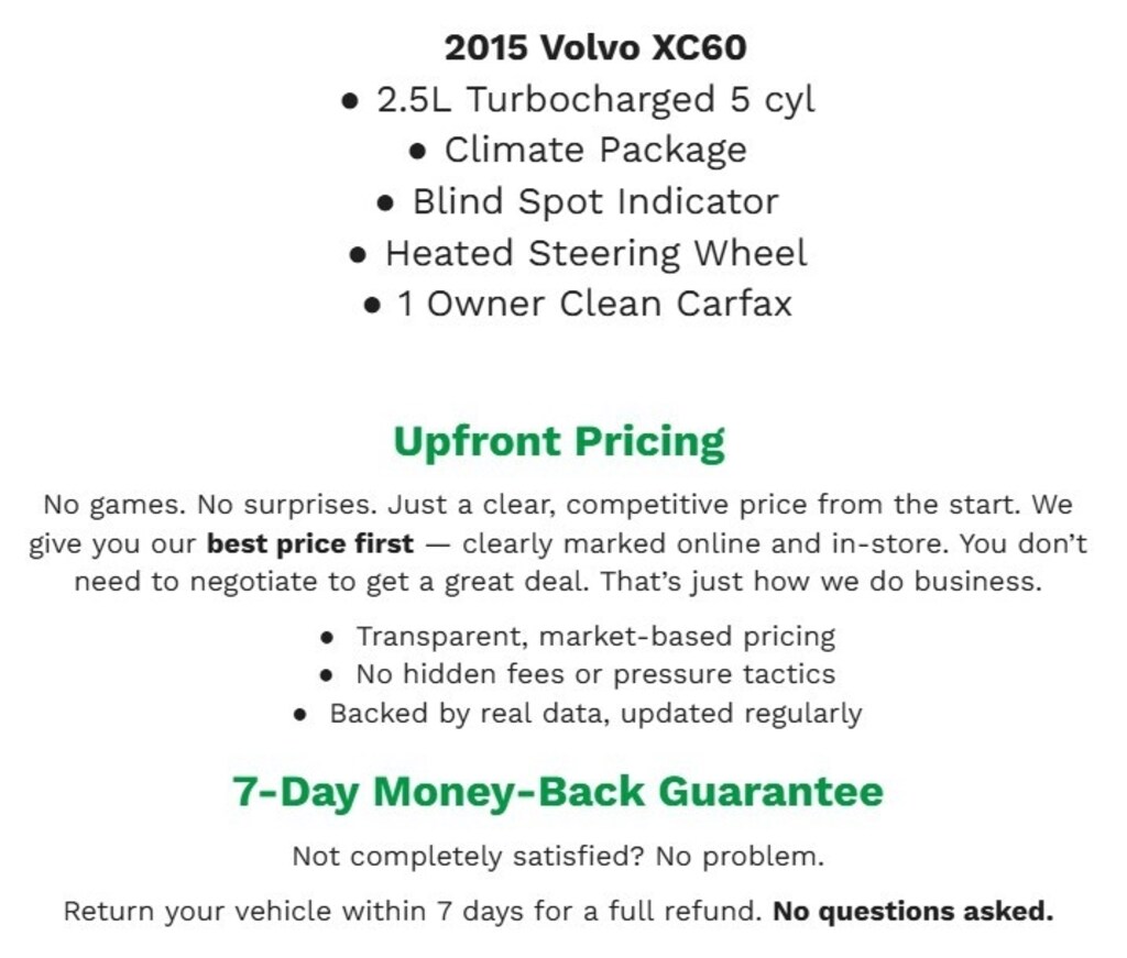I have aways wanted a Volvo and purchased the XC-60 AWD a year ago. Love, love, love it and recommend to anyone looking for an SUV. The safety especially in rainy weather is amazing. I feel so confident in heavy rains due to traction control, handling and weight of the SUV. During a recent ice/snow storm, yes in North Carolina, my husband drive it and there were no problems what so ever. We are getting ready to purchase a Volvo Sedan S60. Great on trips, love the confidence and reliability.… - 5.0